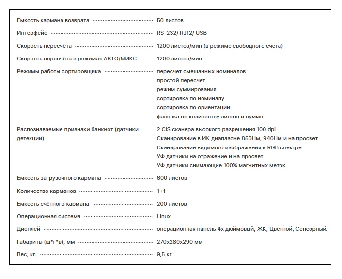 Основные характеристики: Безукоризненная точность. Работает 24/7 с высокой интенсивностью. Продвинутая система управления на основе искусственного интеллекта; Работа с 5ю популярными валютами мира; Сканирование видимого изображения в RGB спектре. Сканирование в ИК диапазоне 850нм, 940нм и на просвет; 2 Cis сканера высокого разрешения 100 dpi; УФ датчики на отражение и на просвет. МГ датчики снимающие 100 % магнитных меток; Проверка на подлинность. Все виды детекции банкнот; Комплексная проверка банкнот в высоком разрешении. Определение номинала, ориентация и модификация банкнот.