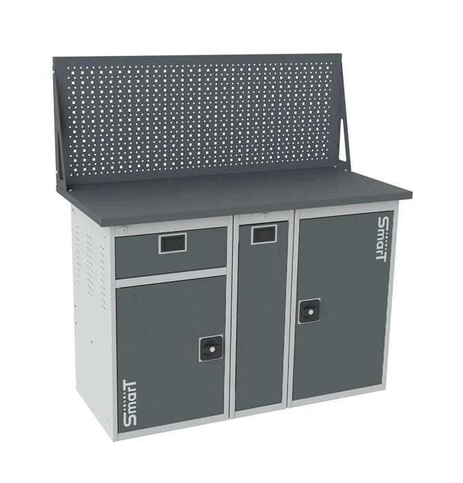 Дополнительно на верстак можно установить: перфорированный экран SMART, комплект освещения SMART, аксессуары на экран SMART, возможна установка системы мастер ключ.