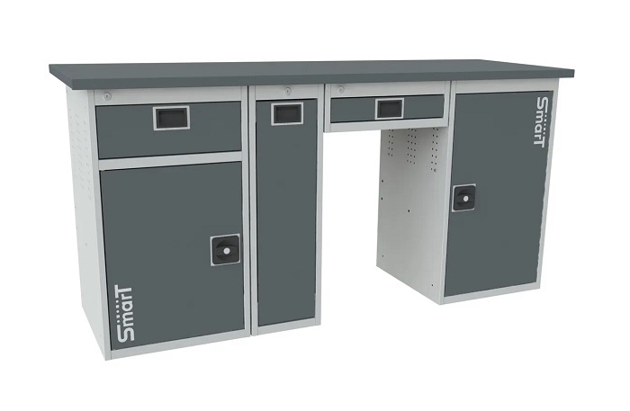 Промышленная мебель SMART предназначена для использования на легких производствах, в гаражах и мастерских. Представляет собой сборно-разборную конструкцию. Выдерживает равномерно распределенную нагрузку 300 кг на верстак и 30 кг на полку. Все элементы изготовлены из высококачественной стали и учитывают структуру расположения волокон металла, что позволяет уменьшить толщину применяемого металла и уменьшает вес изделия с сохранением несущих нагрузок. Слесарный верстак SMART 1760-1-1-Р-У-1 состоит из Столешницы  1760 SMART, Тумбы-пенала SMART, Ящик подвесной SMART-1, Тумбы SMART-2, Тумбы SMART-1. Тумбы комплектуются выдвижным ящиком с телескопическими направляющими, Полкой, Дверьми, которые закрываются на единый цилиндрический замок, квадратной и круглой Перфорациеей. Тумба-пенал позволяет размещать крупногаборитные инструменты и акссесуары. Дверцы тумб имеют возможность смены стороны открывания. Верстак окрашен порошковой краской, устойчивой к механическим воздействиям и агрессивным жидкостям. Цвет темно-серый (RAL 7016)+светло-серый (RAL7035). Поставляется в разобранном виде. Дополнительные комплектующие- экран, комплект освещения, антискользящий коврик, перегородка, ящик-органайзер, навески под все типы ручного инструмента, урна, крепление для монитора, держатель полотенец