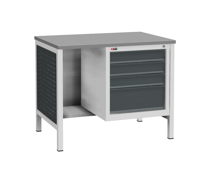 В комплектацию верстака входит: столешница ВЛ-К 100, опора ВЛ-К, подвесная тумба ВЛ-К-014, промежуточная панель ВЛ-К, панель облицовочная к опоре ВЛ-К. Столешница выполнена из фанеры толщиной 25 мм и сверху покрыт оцинкованным листом металла. Тумба комплектуется 4 выдвижными ящиками. Высота ящиков: 3 - 100 мм и 1 - 200 мм. Закрывается центральным ключевым замком. Опора сварная. Размер опоры (ВхШхГ) - 800х40х660 мм. Промежуточная панель устанавливается между двумя опорами и предназначена для придания жесткости верстаку. Одновременно является задней стенкой или нижней полкой. Панель облицовочная перфорированная устанавливается на опору (на боковую часть верстака). Цвет: корпус - серый Ral 7038, лицевая панель ящиков и панели - антрацит Ral 7016. Поставляется в разобранном виде.