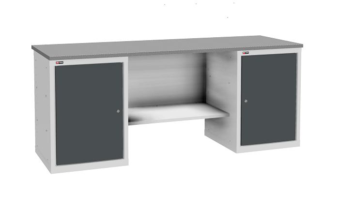 В комплектацию верстака входит: столешница ВЛ-К 200, полка и стенка ВЛ-К, две тумбы ВЛ-К-010. Столешница выполнена из фанеры (24 мм) с покрытием из оцинкованного листа металла. Тумба ВЛ-К-010 комплектуется двумя полками и дверью. Тумба закрывается центральным ключевым замком (50 000 циклов).