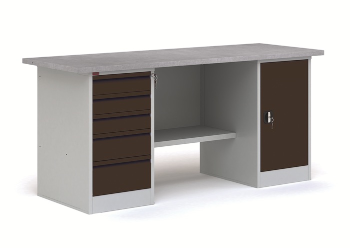 В комплект верстака ВП-4/1,9 черный входит: столешница СТ-1,9 из МДФ, покрытая оцинкованным листовым металлом, комплект К-3/1,9 (стенка задняя металлическая), тумба Т-2 с пятью выдвижными ящиками, тумба Т-1 с двумя съемными полками. Тумбы закрываются ключевым замком.