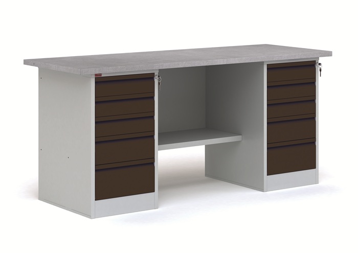 В комплект верстака ВП-6/1,9 черный входит: столешница СТ-1,9 из МДФ, покрытая оцинкованным листовым металлом, комплект К-3/1,9 (стенка задняя металлическая), две тумбы Т-2 с пятью выдвижными ящиками. Тумбы закрываются центральным ключевым замком.