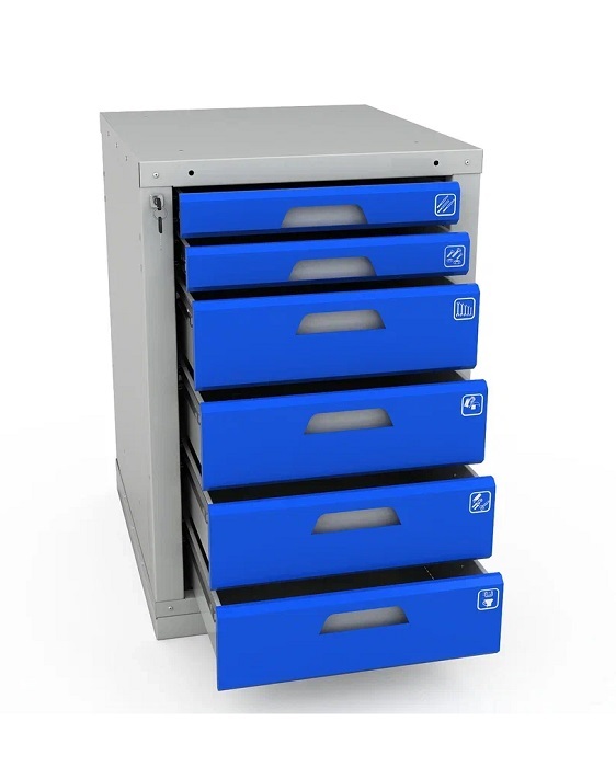 Цвет: корпус верстака - серый Ral 7035, лицевая панель тумбы Ral 5005. Поставляется в разобранном виде.